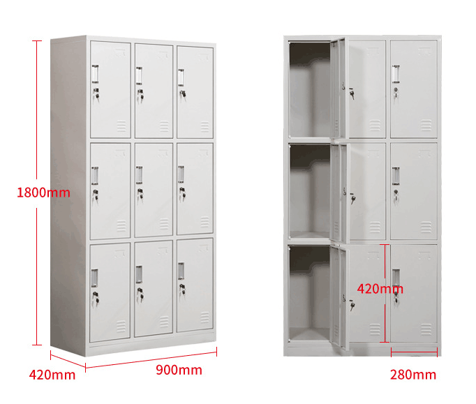 3. 结构与配件:多为3层9格的独立分区设计,每门配钥匙锁,钥匙一对一编码不互开,也可定制密码锁、感应锁。部分款式带不锈钢挂衣杆、可调节隔板,柜门多设有通风孔,还配有标示牌框方便分类识别。