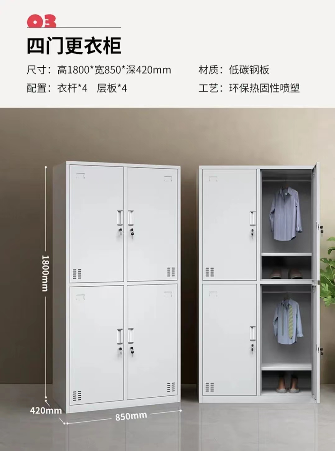 - 其他配件:每门内侧可配挂衣杆、衣钩,部分带可调节隔板;底部可装防潮地脚(高度≥50mm)。